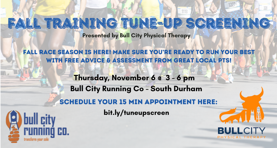 All too often big miles and hard workouts can result in tired, achy bodies. Don't worry, we've called in the experts from Bull City Physical Therapy to help get you to the finish line. Schedule your free 15-minute appointment today! More Details